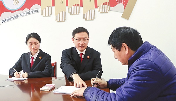 图为安徽省六安市裕安区人民法院法官李行(中)为张老汉办理领款手续。黎明畅 摄