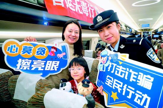 图为北京铁路公安处乘警支队民警在G107次列车上开展反诈宣传。