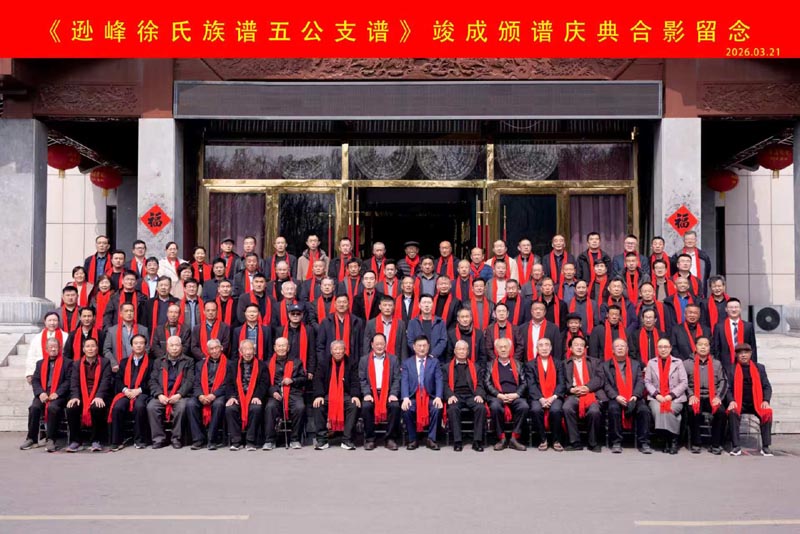 2026年3月21日上午9时,逊峰徐氏族谱五公支谱峻成颁谱庆典在山东五莲县良友喜事会大酒店一楼莲心厅隆重举行。参加这次庆典活动的嘉宾有原日照市科协主席徐立永,日照市郭氏联谊会会长、五莲良友集团董事长郭长征,徐州市徐家大院彭城徐氏族谱编委会主任徐永平,徐州市原铜山区国土局局长彭城徐氏族谱主编徐永杰,全国著名家居环境策划师徐永勤,徐州市宗亲代表徐良海,凤墩徐氏老族谱汇编主编徐殿臣,山东省历史学会徐国文化研究会专业委员会秘书长徐飞,山东历史学会徐国文化研究会专业委员徐宝国,莒县徐家当门徐氏族谱主编徐金春,五莲县酒立坊徐家烧酒总经理徐士祥,青岛西海岸新区圣海文化艺术研究院院长徐会君,日照市招标公司经理徐增涛,山东省第十一、十二届人大代表、省美术协会会员、日照市美术协会综合材料艺术委员会主任、日照市书法协会常务副秘书长徐立峰,中国书法家协会国展获奖作者、省书法家协会理事、日照市书法协会秘书长徐磊,诸城市著名书法家徐志聪,中书协会员、日照市著名书法家徐泽平,五莲县著名书法家徐茂正、徐云成等十数位宗长宗亲和各村各支宗亲代表150余人参加了这次颁谱庆典。